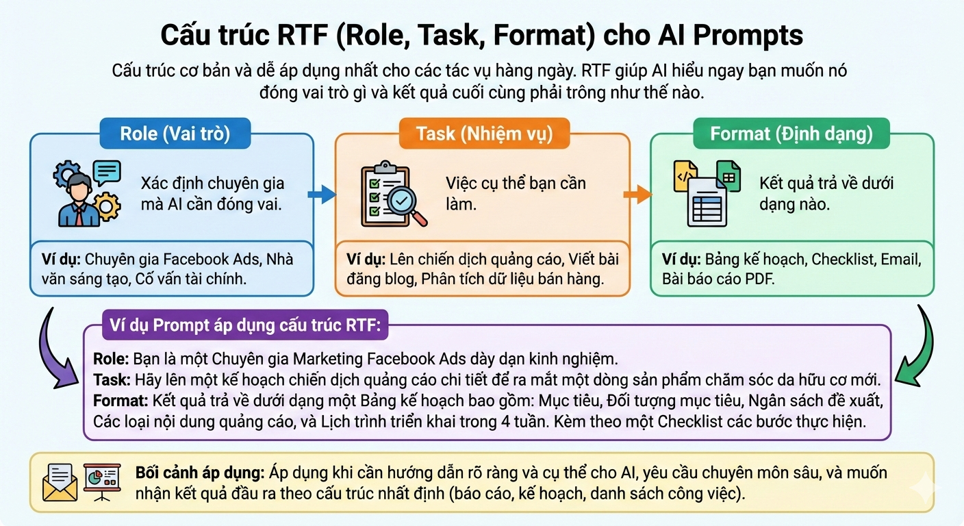 Cấu trúc RTF giúp AI đóng đúng vai chuyên gia và trả kết quả đúng định dạng mong muốn.
