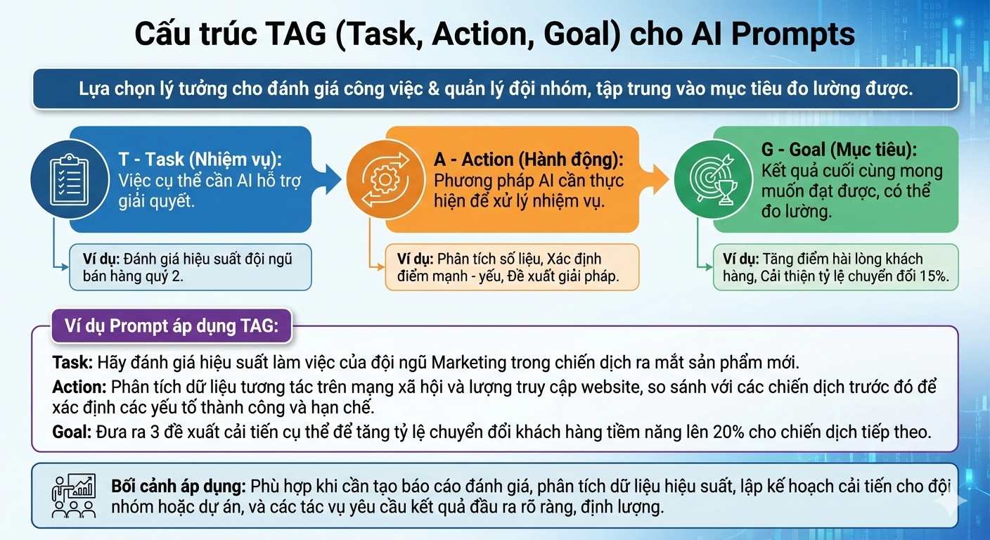 Nếu bạn đang cần đánh giá công việc hoặc quản lý đội nhóm, TAG là lựa chọn phù hợp. Cấu trúc này tập trung vào mục tiêu đo lường được.