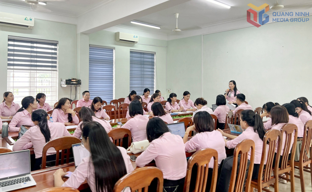 Cán bộ, giáo viên Trường THCS Chu Văn An (phường Cẩm Phả) sinh hoạt chuyên môn về phương pháp Dạy học tích cực kết hợp sử dụng AI nâng cao chất lượng giờ dạy. Ảnh: Báo Quảng Ninh