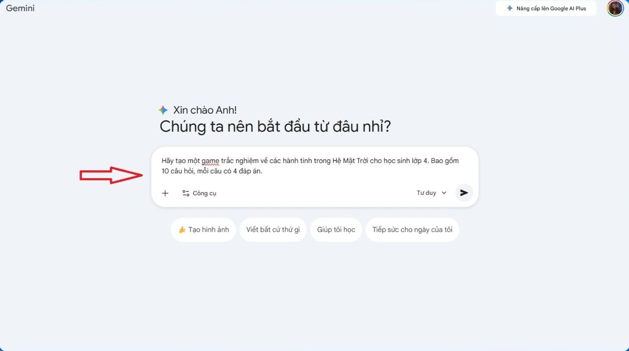 Vai trò: Yêu cầu Gemini đóng vai một chuyên gia (ví dụ: Chuyên gia thiết kế trò chơi giáo dục, nhà khoa học, hoặc giáo viên lịch sử tâm huyết).